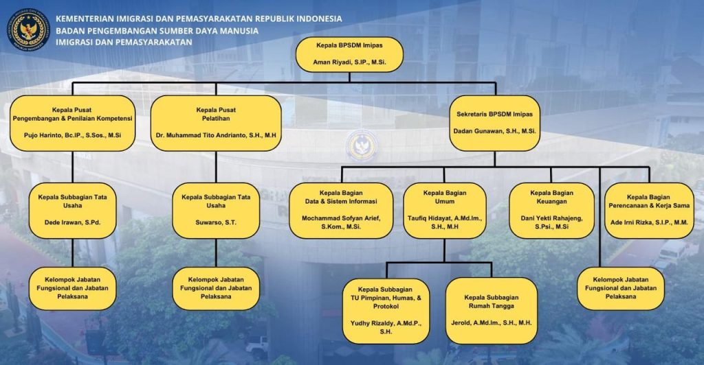 Badan Pengembangan Sumber Daya Manusia (BPSDM) Imigrasi dan Pemasyarakatan merupakan lembaga yang bertanggung jawab dalam pengembangan kompetensi serta peningkatan kualitas sumber daya manusia di bidang imigrasi dan pemasyarakatan. Struktur organisasi ini mencerminkan sinergi dan koordinasi yang kuat antara berbagai unit, guna memastikan bahwa setiap program pelatihan, pengembangan kompetensi, dan reformasi birokrasi dapat berjalan dengan efektif dan memberikan kontribusi nyata bagi kemajuan sektor imigrasi dan pemasyarakatan di Indonesia.